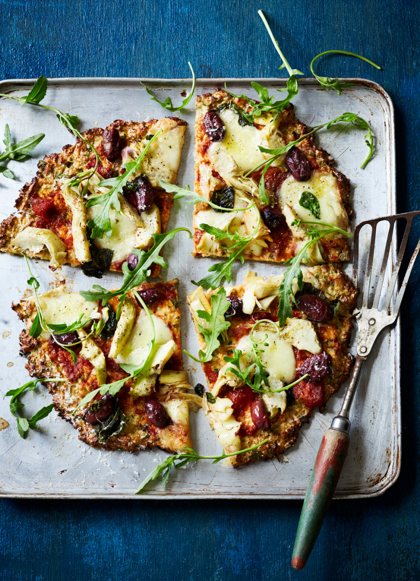 Cauliflower has evolved into the hot new ingredient and is turning up regularly as “couscous” – it also works beautifully in this pizza base.