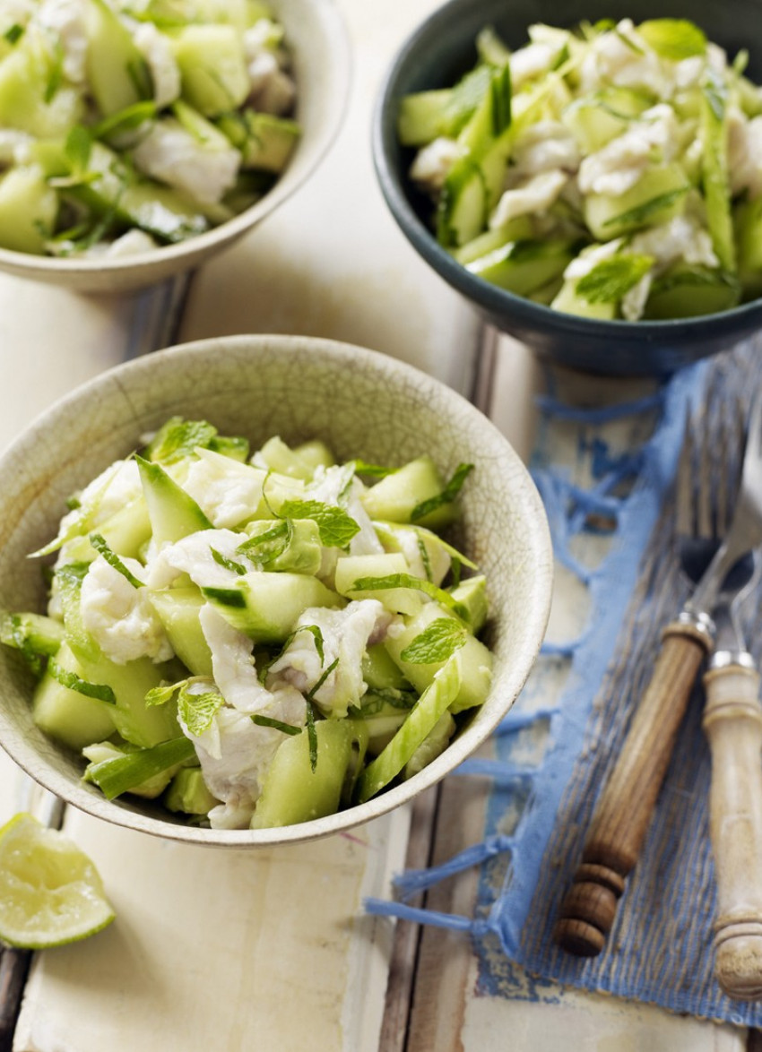 A fresh, vibrant and healthy dish using fresh, white fish fillets with melon, mint and cucumber – the perfect appetiser.