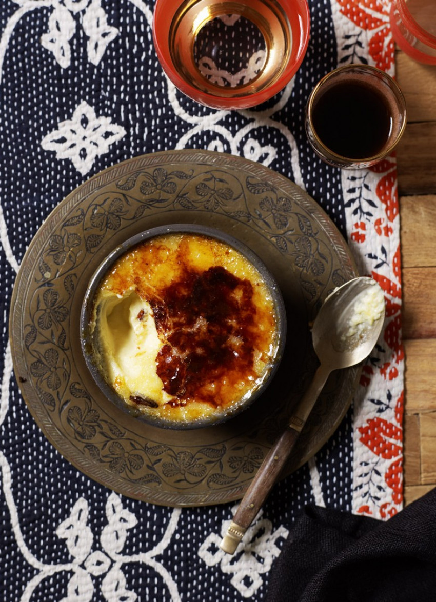 Brûlée: Put the cream, milk and all the spices and the vanilla in a saucepan and bring to just below boiling point. Whisk the egg, egg yolks and sugar in a large bowl then very slowly whisk the hot cream with the aromatics into the egg mixture. Cool then cover and chill for up to 2 days to infuse the flavours.
