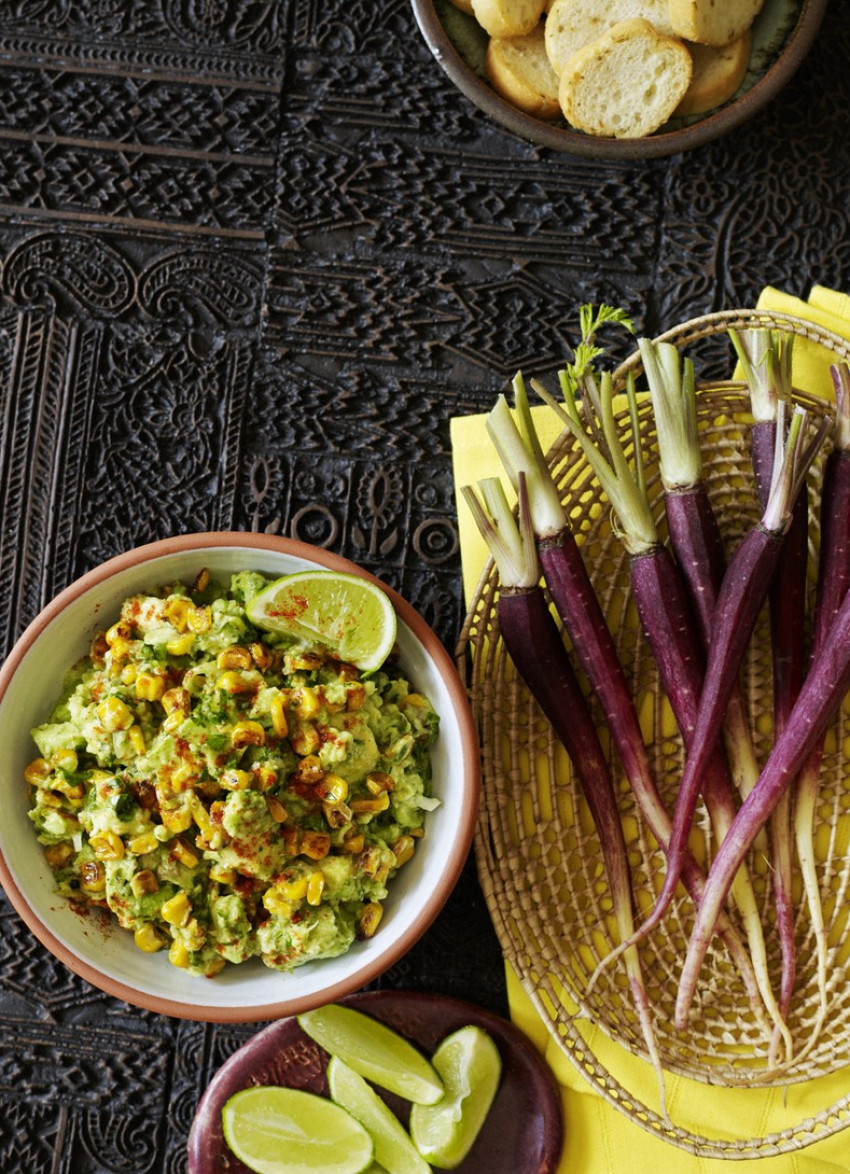 Cut the avocado into large chunks and add to the dressing, roughly crushing with a fork but leaving it a little chunky. Fold in the corn and coriander, season generously, adding more lime juice if needed. Transfer to a serving bowl and sprinkle with paprika. Serve with crostini, baby carrots and lime wedges. Makes about 2 cups