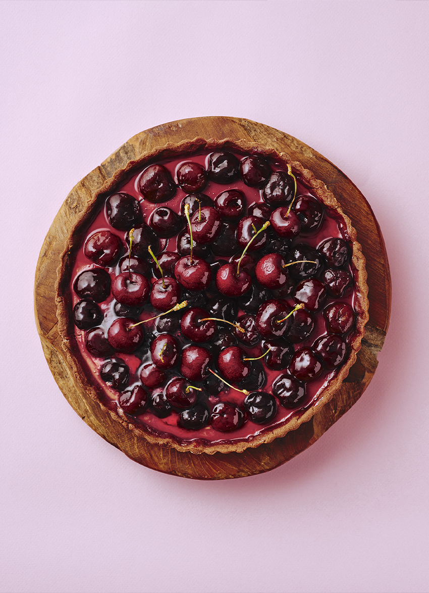 This glossy, jewel-toned tart brings together creamy cheesecake, buttery cocoa pastry, and sweet summer cherries — the perfect dessert for festive entertaining.
