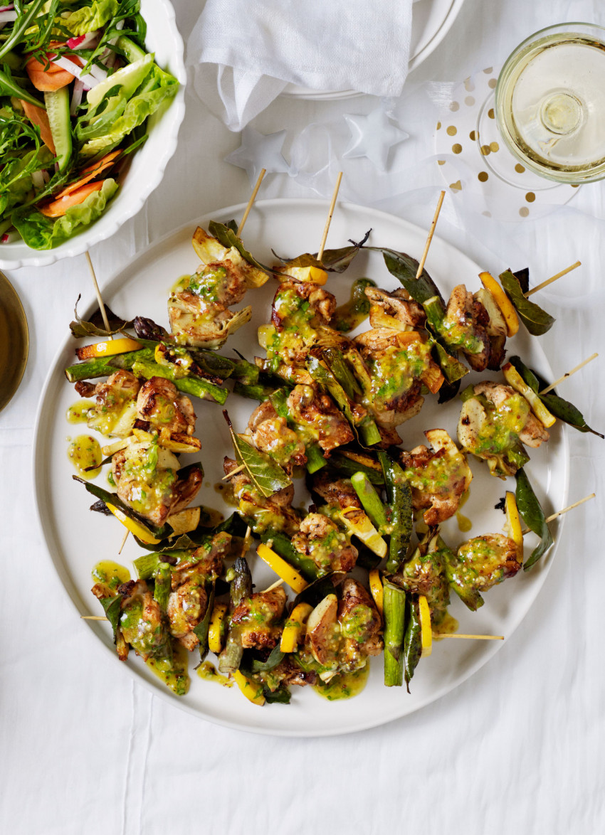 To assemble: Thread the components onto the skewers, alternating the vegetables, chicken, lemon and bay leaves. Season with salt and pepper.