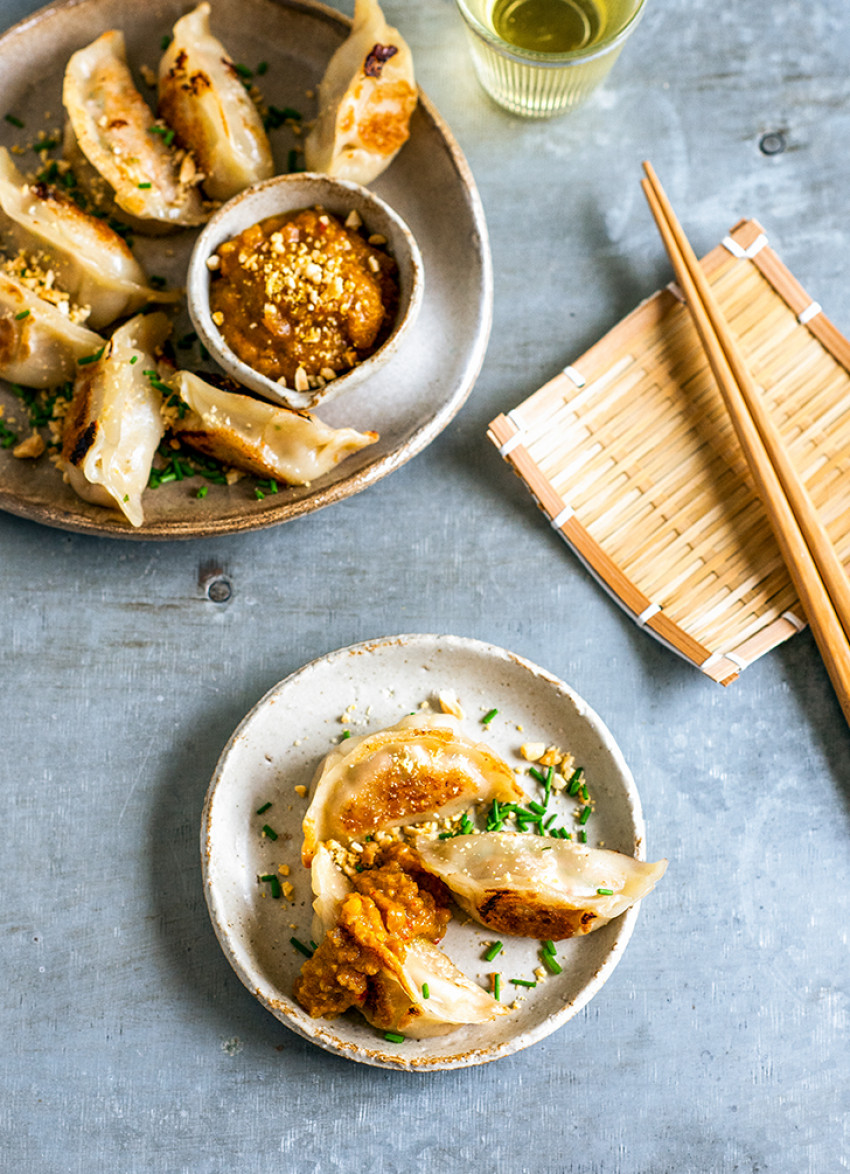 This is such a crazy but satisfying combination – fragrant, pot-sticker dumplings with lashings of hot and spicy peanut sauce.