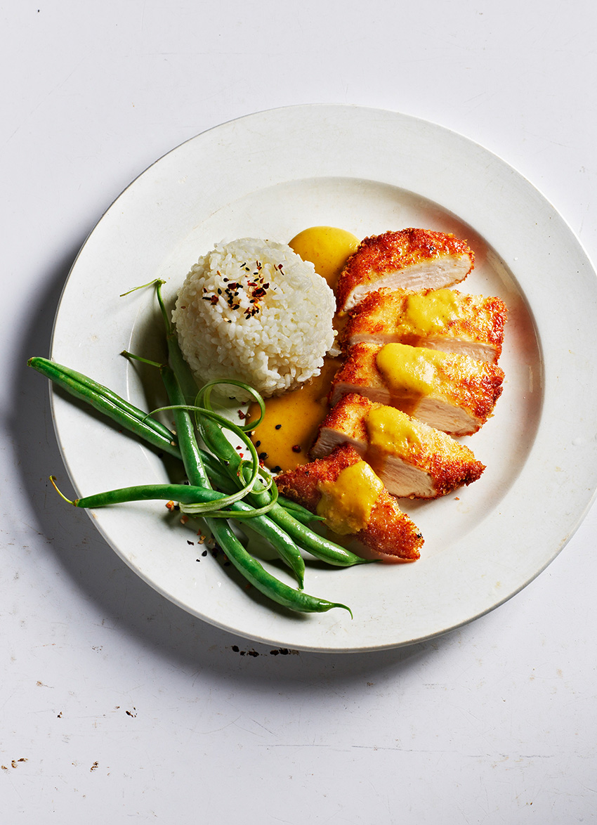 You can find chicken katsu in Wagamama, Yo! Sushi and Itsu as well as in supermarket chiller cabinets, testimony to the dish’s popularity in this country. There are probably very few people under the age of 30 who don’t know it. It’s a dish that combines the Japanese love of protein fried in panko breadcrumbs with the flavours of India. Personally, being perhaps more familiar with the flavours of India than many Japanese, I prefer my katsu a little bit hotter than usual, so have added a modest amount of cayenne pepper to the recipe and I like a splash of vinegar to give it a bit more vigour. Katsu curry often appears on vegetarian menus, and I think slices of aubergine are the perfect alternative to chicken.
