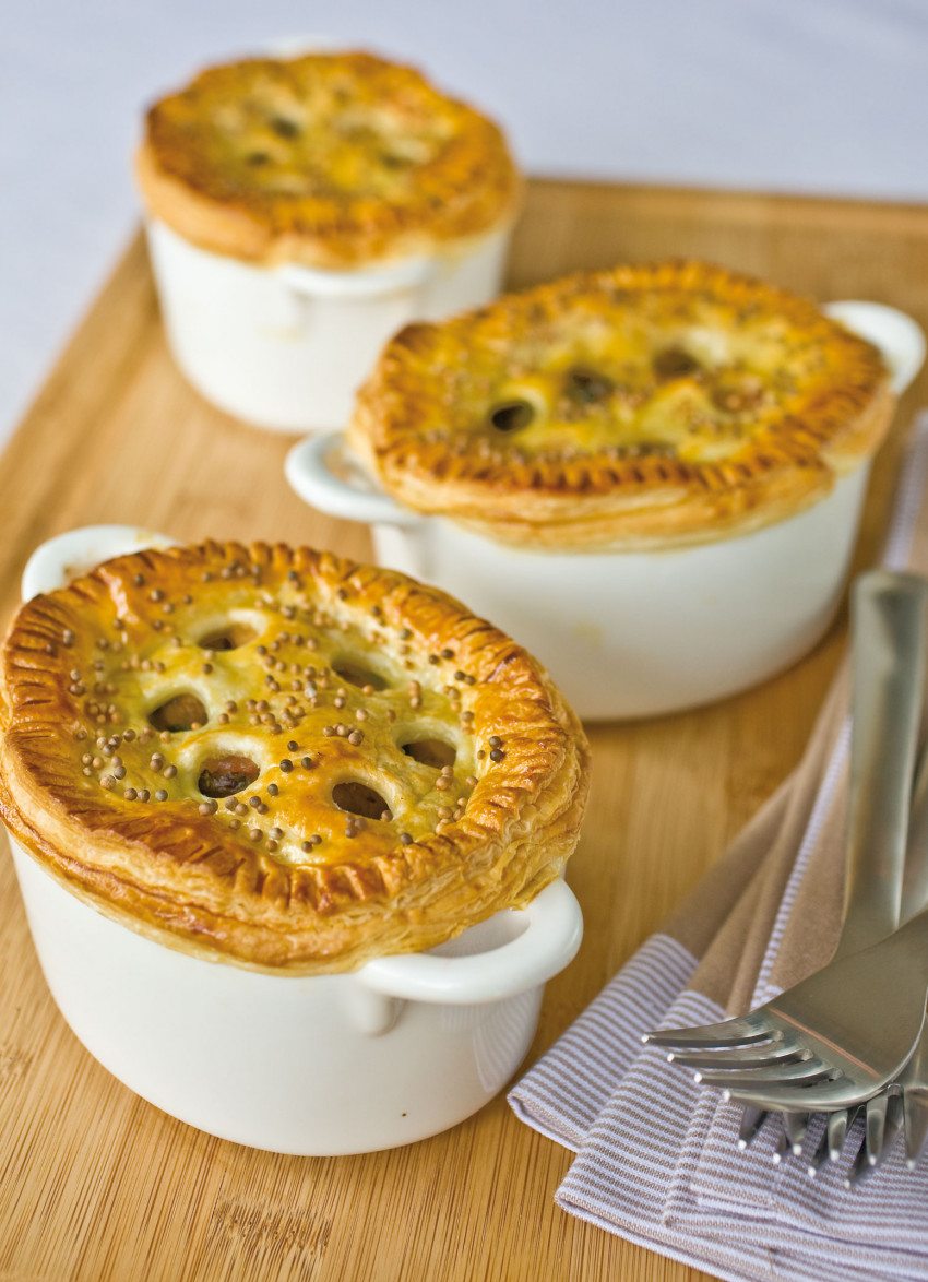 To finish: Preheat the oven to 180°C. Divide the filling between the baking dishes. Brush the pastry rims with the egg yolk and milk and press a lid onto each pie. Crimp the edges together with a fork. Using a pastry brush, egg wash the tops and sprinkle with mustard seeds.