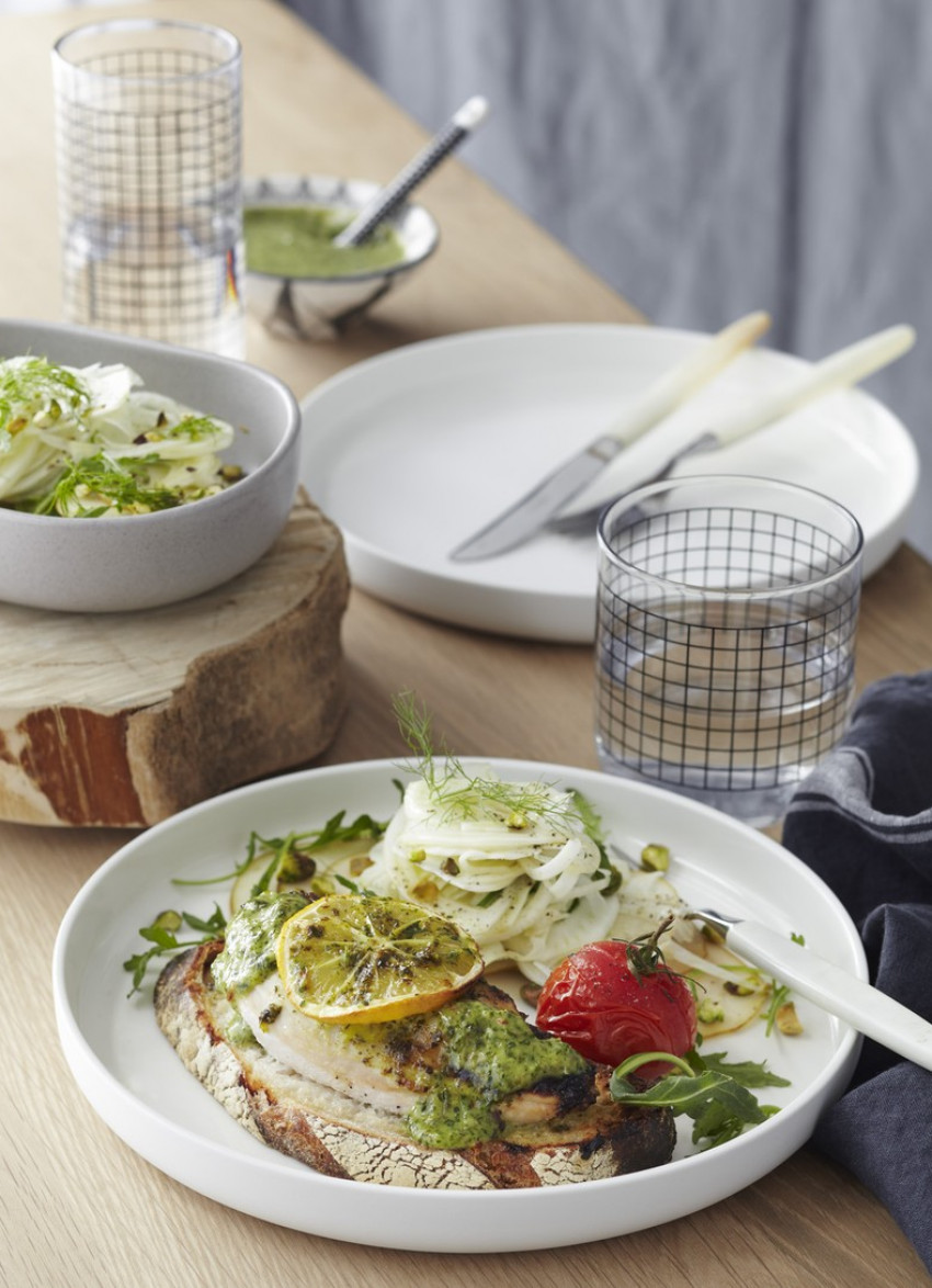 Rub both sides of each of the slices of bread with the garlic clove then place on a lipped baking tray. Top each ‘crouton’ with a chicken breast, skin side up. Rub the lemon slices through the dish the chicken was in then place on top of the chicken. Roast for 30 minutes or until the chicken is cooked through. Cooking time will depend on the thickness of the chicken. Serve the remaining herb sauce separately and accompany with a salad of thinly shaved pear, fennel and rocket with pistachios.