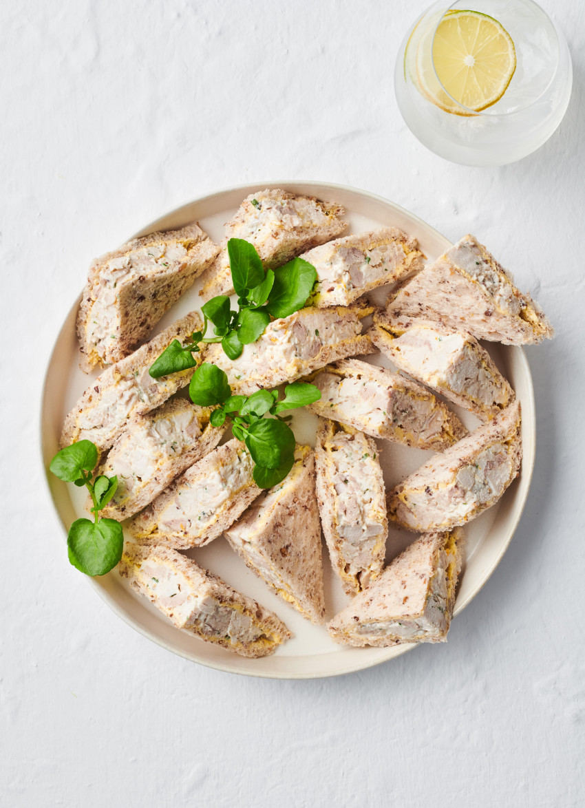 TO ASSEMBLE: Butter one side of each slice of bread. Lay out 10 slices, buttered side up and divide the filling between them. Gently spread the chicken with a fork, leaving a ½cm edge around the bread. Don’t push it down flat as the sandwiches need to look full and inviting. Top with the remaining bread. Cut off the crusts using a very sharp bread knife, then cut each sandwich into quarters. Arrange on a serving platter. If making ahead of time, cover with a damp tea towel to ensure they don’t dry out.