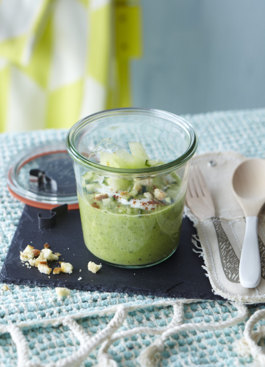 The rich silkiness of this soup comes from the avocado and is perked up by the hint of wasabi and the sweetness of fresh melon and cucumber.
