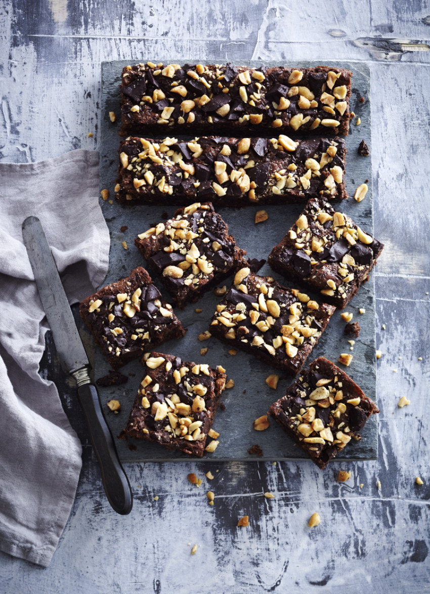 Tip into the cake tin and spread evenly then sprinkle over the chocolate, then the peanuts.