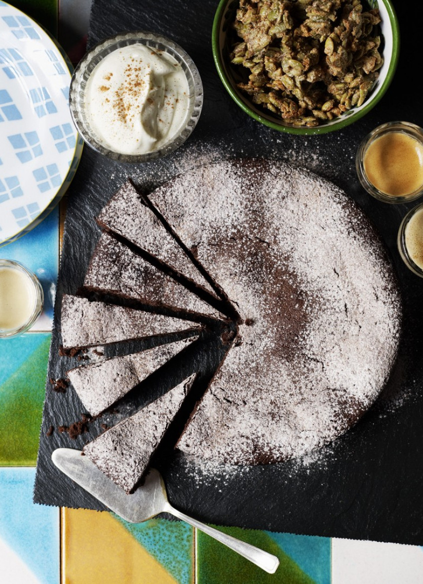Dense, rich and moist with a little hint of chilli and cinnamon – everything a great chocolate cake should be, and even more delicious when served with candied pepitas.
