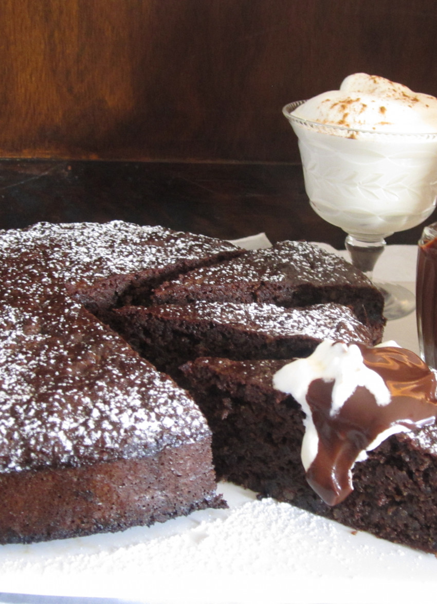 To serve: Place the cake on a serving plate and dust with icing sugar. Serve with the chocolate sauce either warm or at room temperature and lashings of softly whipped cream.