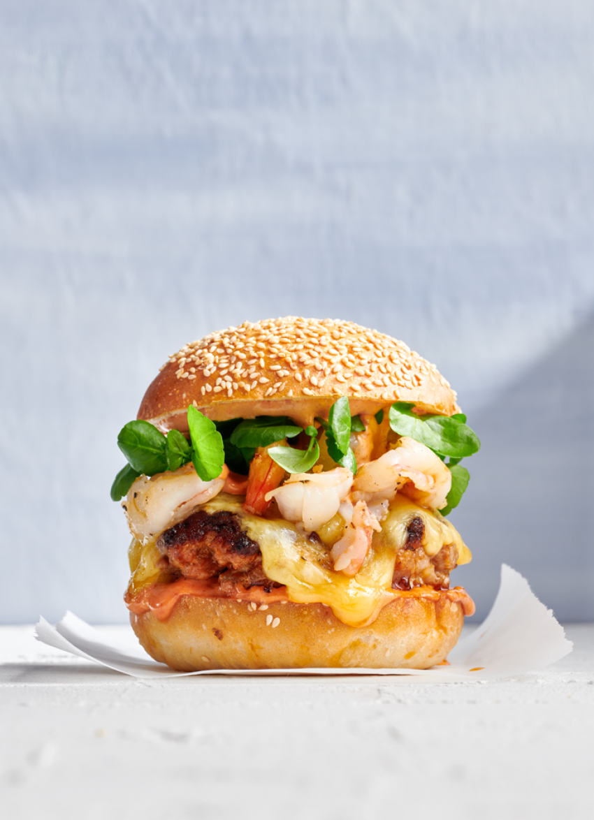 Combining fresh chorizo sausage with a good pork sausage makes for a less dense burger patty that is still packed with fabulous flavours. Add garlicky prawns and a spicy mayo and this epic burger will have you licking your fingers.