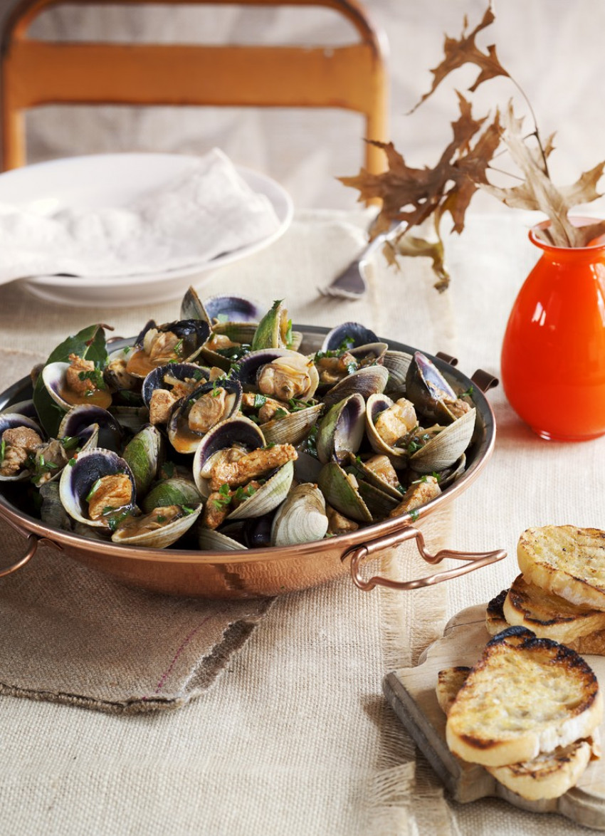 Add the onion, garlic, rosemary, chilli flakes, tomato paste and the bay leaf to the pan and cook until the onion is soft, adding a splash of water if the pan is too dry. Add the wine or water and the cockles and turn to coat in the onion mixture. Cover and cook until the cockles have opened. Stir in the pork and parsley, season and tip into a large bowl. Serve with plenty of grilled bread for mopping up the juices.