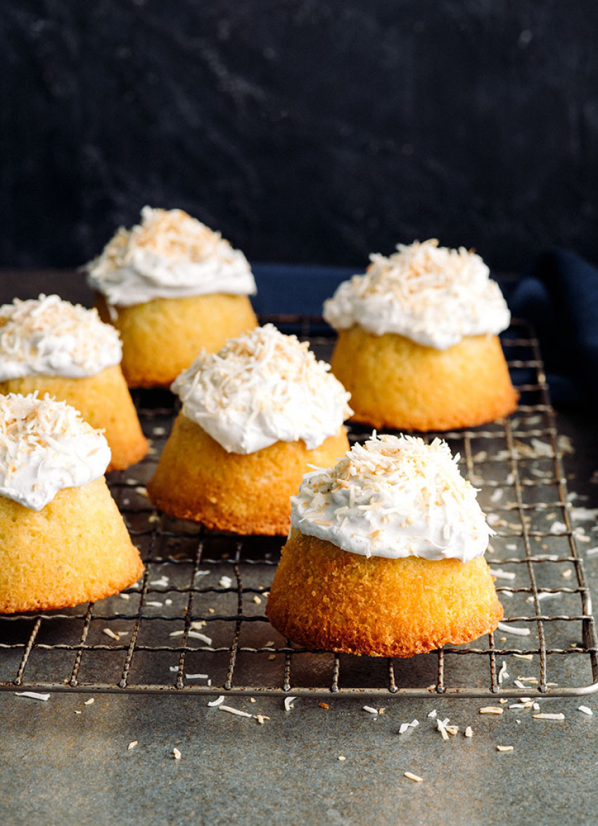 To serve: Spread the coconut frosting over the cakes and top with the toasted coconut. Makes 6