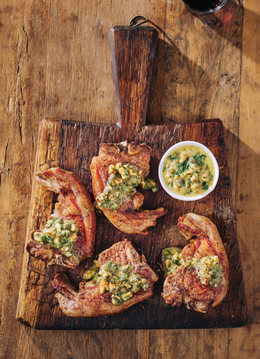 Conscious Valley Thick Cut Loin Chops with Mustard, Caper and Walnut Salsa