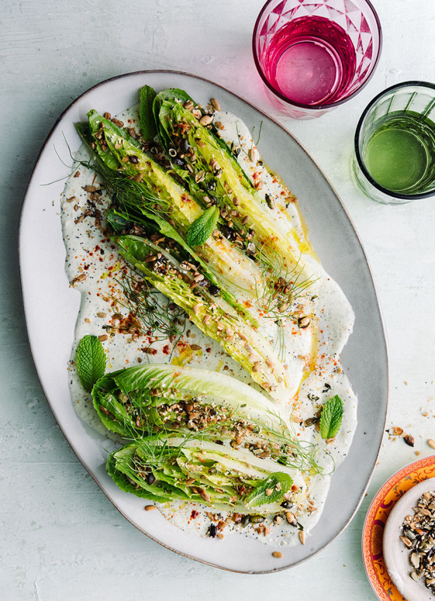 To serve: Spread the raita over the base of a large platter and arrange the cos on top. Scatter over half the seeds, letting them fall between the leaves of the lettuce. Serve the remaining seeds separately. Drizzle with olive oil and garnish with the paprika, mint and dill.