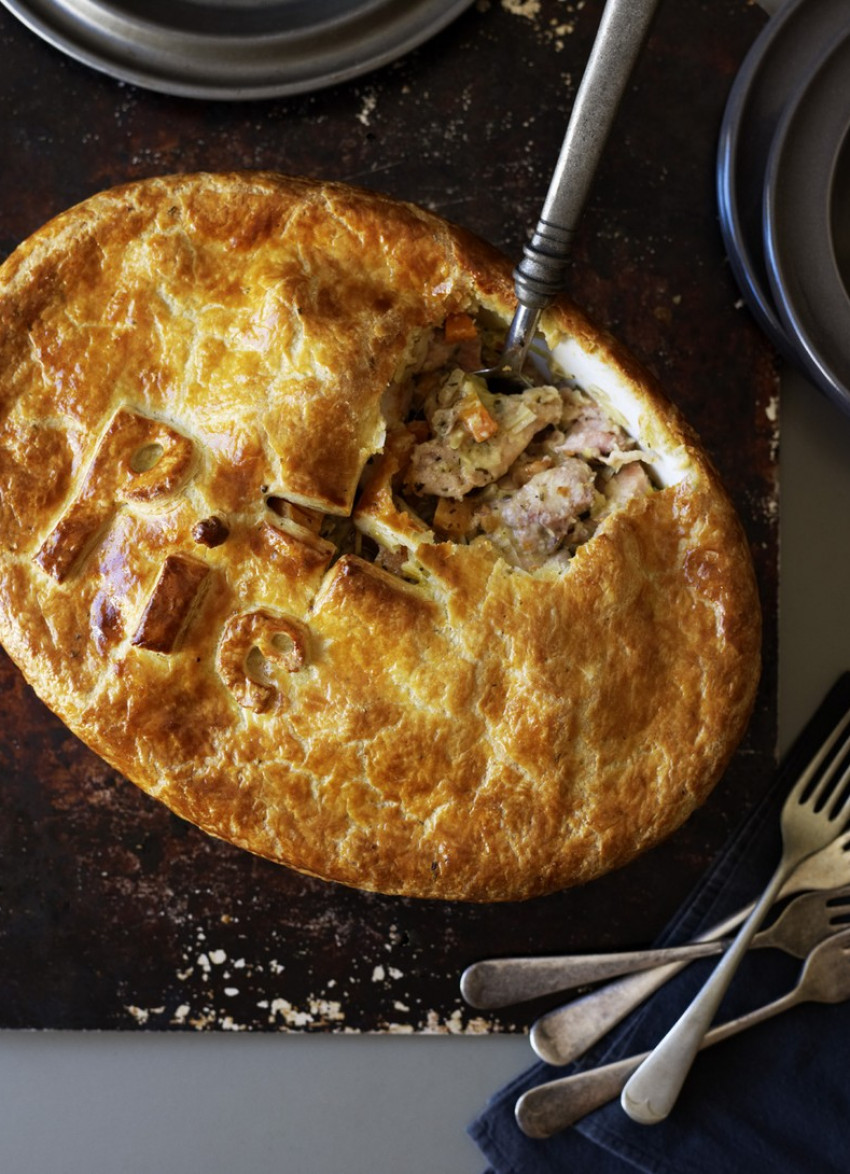 To assemble: Roll the pastry out on a lightly floured bench so it’s large enough to cover the pie and hang down the sides of the dish. Brush with beaten egg and place egg washed side down over the filling. Gently press the pastry against the sides of the baking dish to seal. Brush with egg and cut a cross in the centre of the pastry. If desired, roll out the pastry scraps and stamp out shapes. Decorate the pie and brush with egg. Bake for 30 minutes until the pastry is deeply golden and crisp and the filling is bubbling.