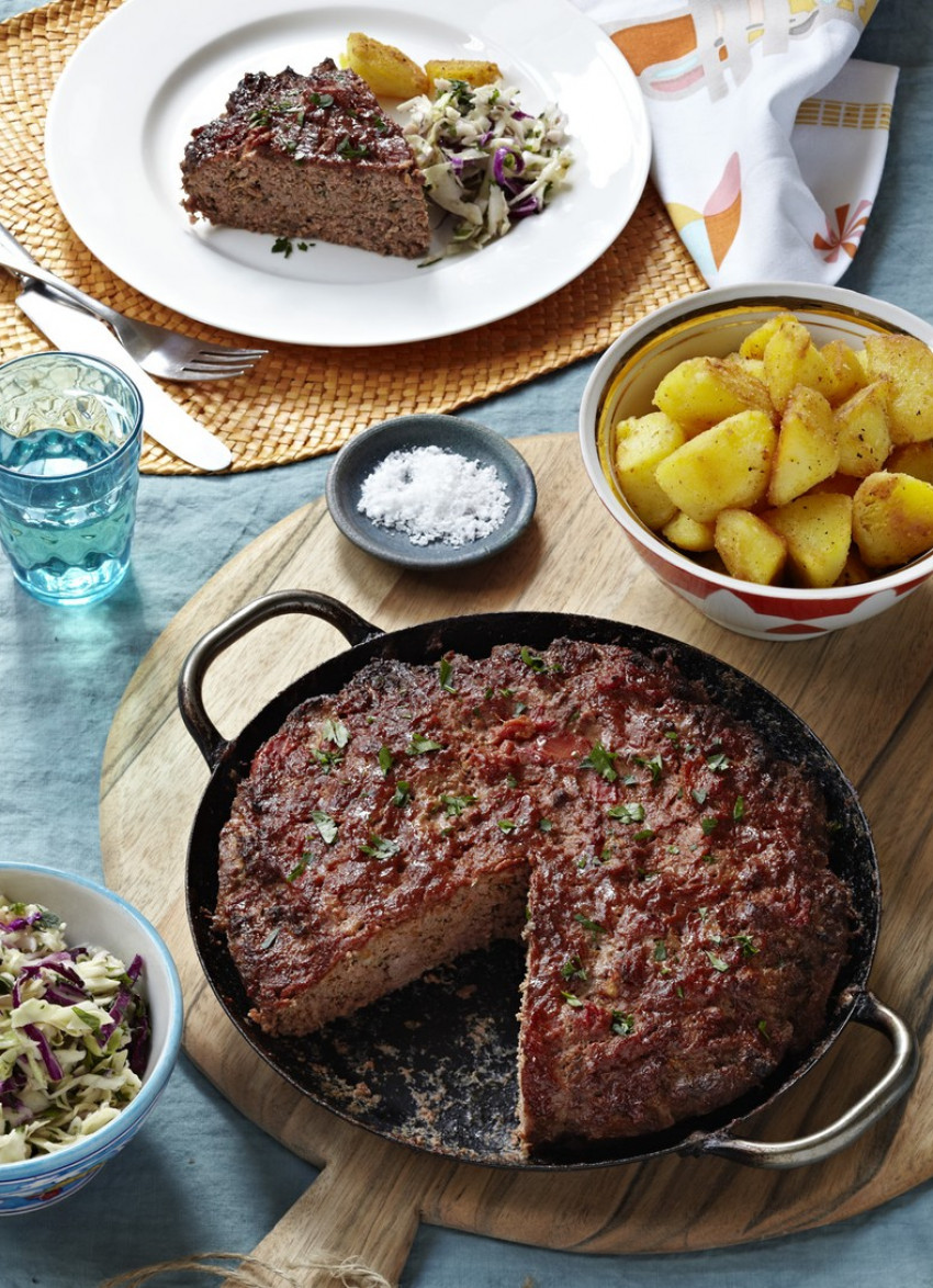 Transfer the mixture to the ovenproof dish and bake for 20 minutes. Spoon the glaze evenly over the top and cook for a further 25 minutes or until the juices run clear. Rest the meatloaf, loosely covered, for 10 minutes before serving.