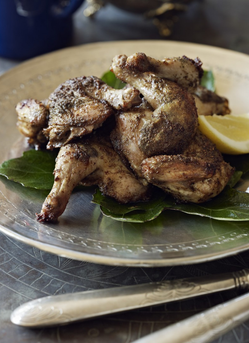 Place on a lined baking tray and brush both sides with olive oil and sprinkle with the remaining fragrant salt. Roast, skin side up, for 40 minutes if cooking poussin or 1 hour 10 minutes if cooking a whole chicken, or until the juices run clear when a skewer is inserted in the thigh. Cover loosely and rest for 10 minutes.