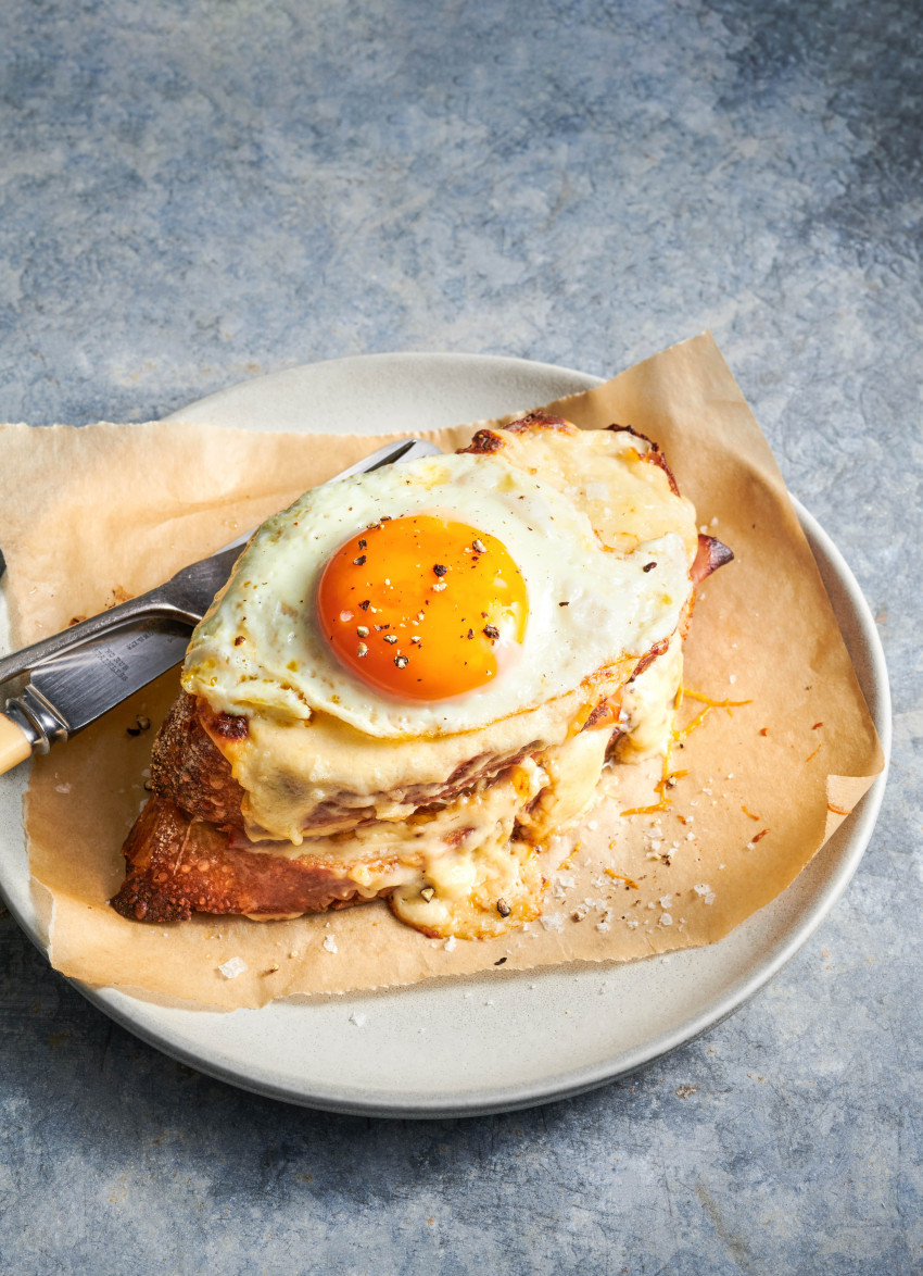 to assemble: Butter one side of each piece of bread. Lay 2 pieces butter-side down on a piece of baking paper. Spread each piece with 3 tablespoons of béchamel sauce and 3 pieces of ham. Top with the onion (if using) and remaining bread, butter side up. Spread with 3 more tablespoons of sauce each. Sprinkle with Gruyère cheese and pop in the oven until golden and bubbling, for about 15 minutes. Top each sandwich with a fried egg.