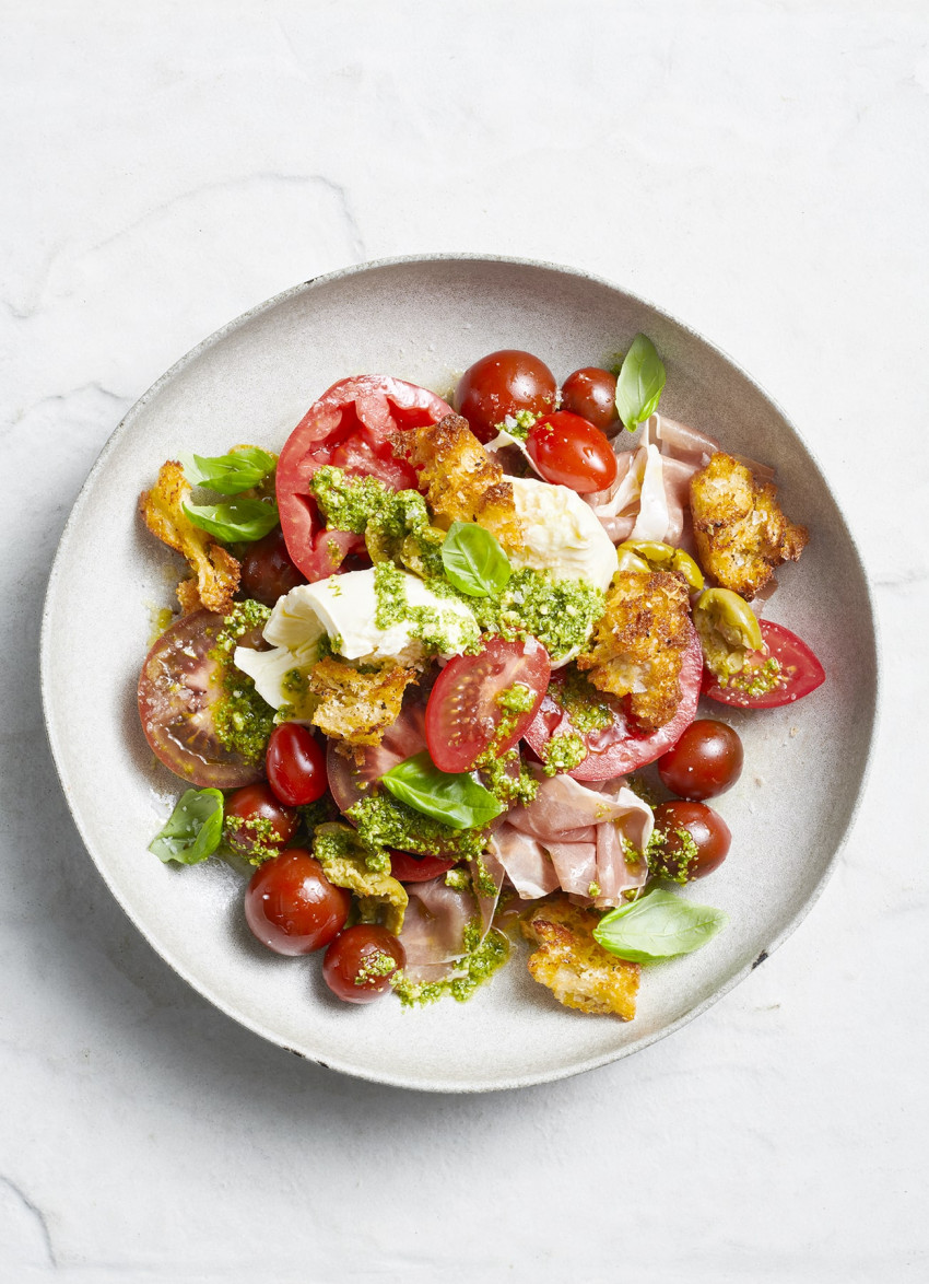 To serve: Toss the tomatoes with the oil and season generously with salt and pepper. Place on a platter and top with the prosciutto, croutons, ripped mozzarella, basil and olives. Drizzle everything with the dressing.