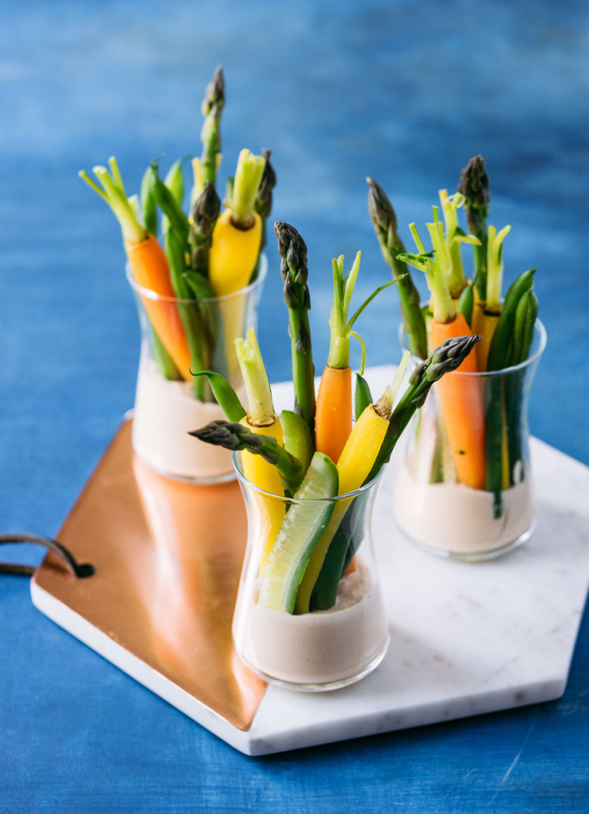assorted vegetables for serving, allow 8–10 pieces per glass: I used blanched asparagus, green beans and baby carrots along with spears of fresh cucumber