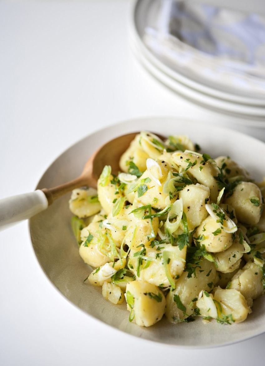 When cool enough to handle, peel if desired. Lightly flatten with the palm of your hand and add to the dressing. Toss gently to combine. Fold through the spring onions and flat-leaf parsley to serve.