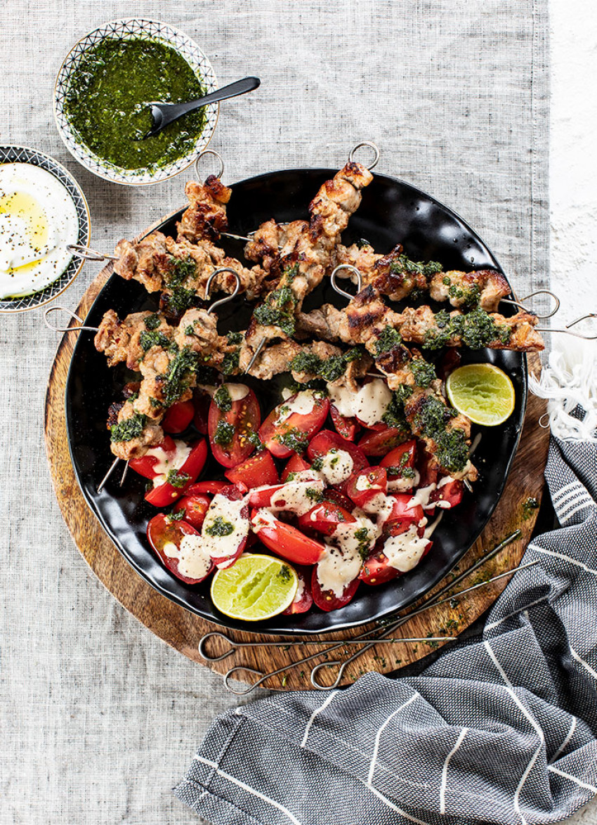 These tasty pork skewers are topped with a vibrant fresh mint relish, which I also use on lamb, chicken and fish. I served them with chopped tomatoes drizzled with tahini.