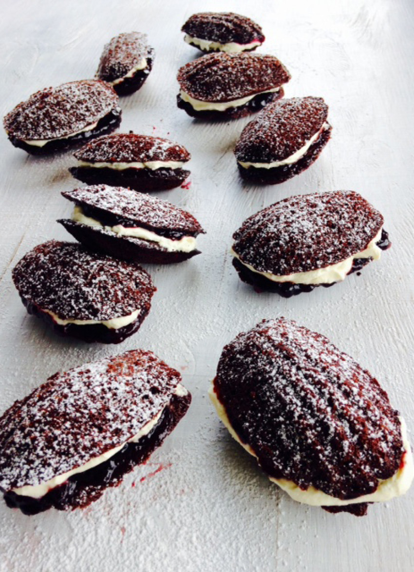 As much as I love madeleines and their wonderful shape, they are a one day wonder and I prefer to make cakes that have a longer shelf life. Here I’ve filled the madeleine tin with my favourite gluten-free friand recipe and sandwiched them together with berry jam and cream.