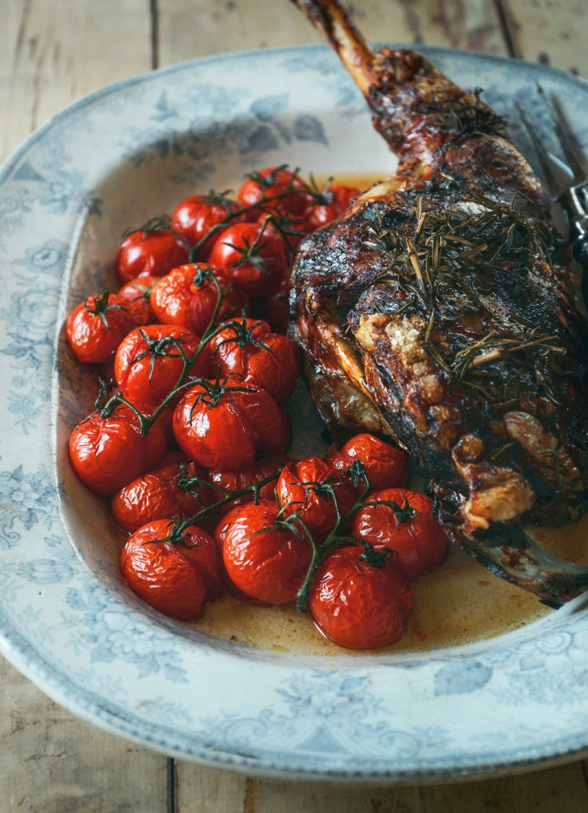 Tomatoes: When your lamb has about 30 minutes left to cook, place the tomatoes in an oven dish, drizzle with olive oil and balsamic vinegar, if using, and season well. Roast on the top rack of the oven for around 40 minutes.