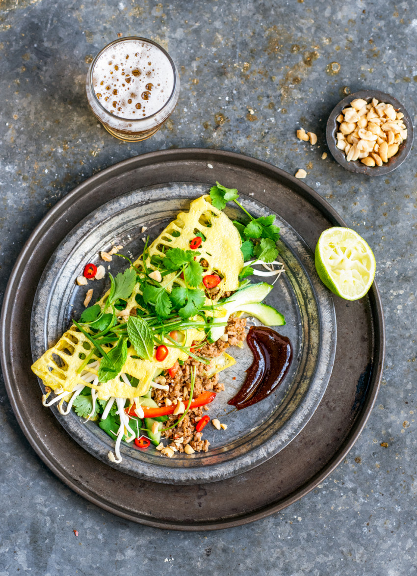 Briefly reheat pork and invite guests to make their own egg nets by placing pork on one half, layering with salad, folding over and garnishing with remaining, herbs, chilli and peanuts. Serve with extra hoisin sauce and limes on the side. Makes 8