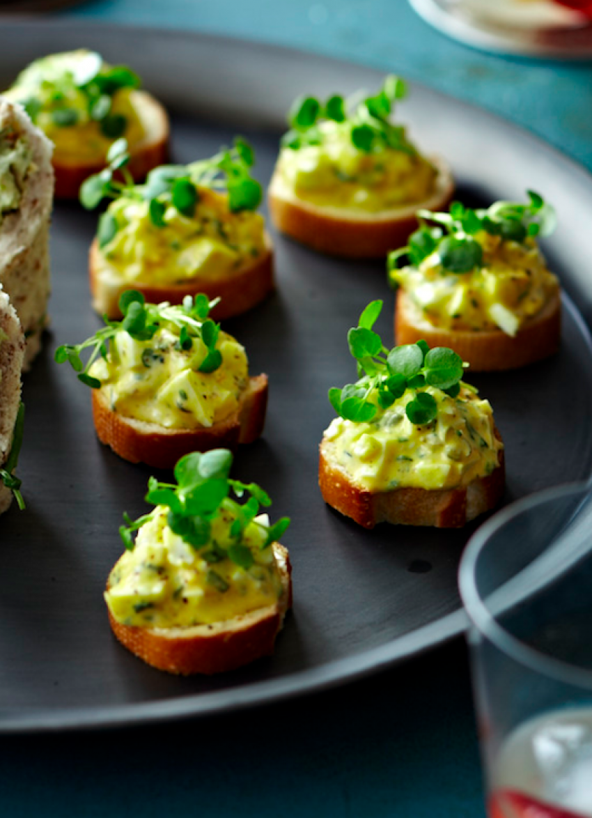To assemble: Butter the baguette slices then top with a spoonful of egg mayonnaise. Add a small pile of greens and a grind of pepper. Makes ??
