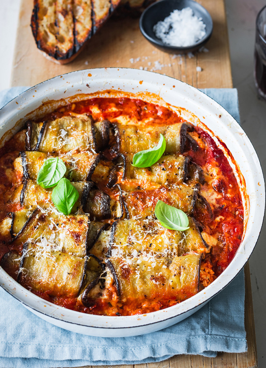 Ricotta and thyme stuffed eggplant parcels baked in a rich tomato and cream sauce. Serve with a green salad and toasted sourdough to mop up all the lovely sauces.