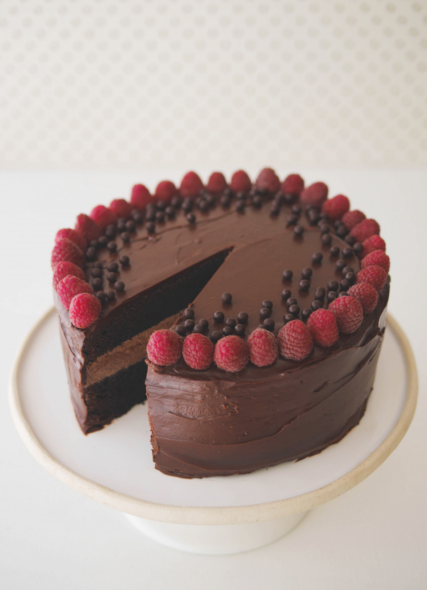 To assemble: I ganache my cake on a clean dry bench and transfer it back to the cake plate with two fish flips, so the plate doesn’t get too messy. Completely cover the top of the cake with some ganache and bring down and around the sides. Use a clean palatte knife to smooth the ganache. Decorate the cake with raspberries around the edge and a few chocolate pearls inside. I serve slices that are 2 raspberries wide. It is a full-on cake, so a slither is perfect.