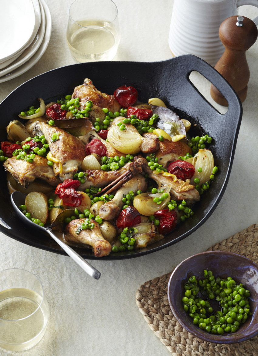 Bake for about 30 minutes, occasionally basting with the pan juices until the chicken is fully cooked and the potatoes are tender. Serve with the following Crushed Green Pea and Mint Salsa, if desired.