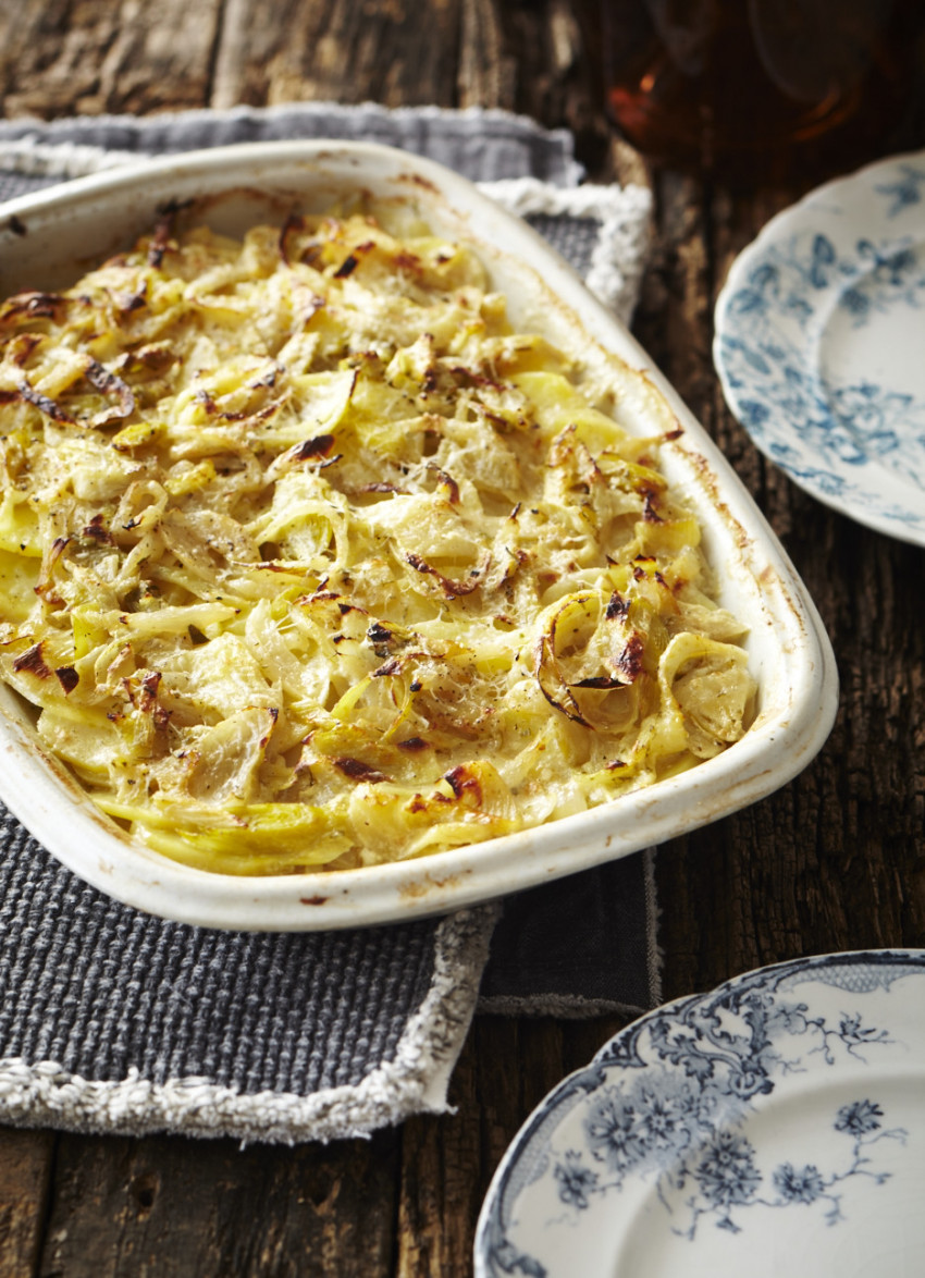 Spread half the potatoes in the baking dish and season. Top with half the leek mixture. Repeat with the remaining potatoes, seasoning and leeks.