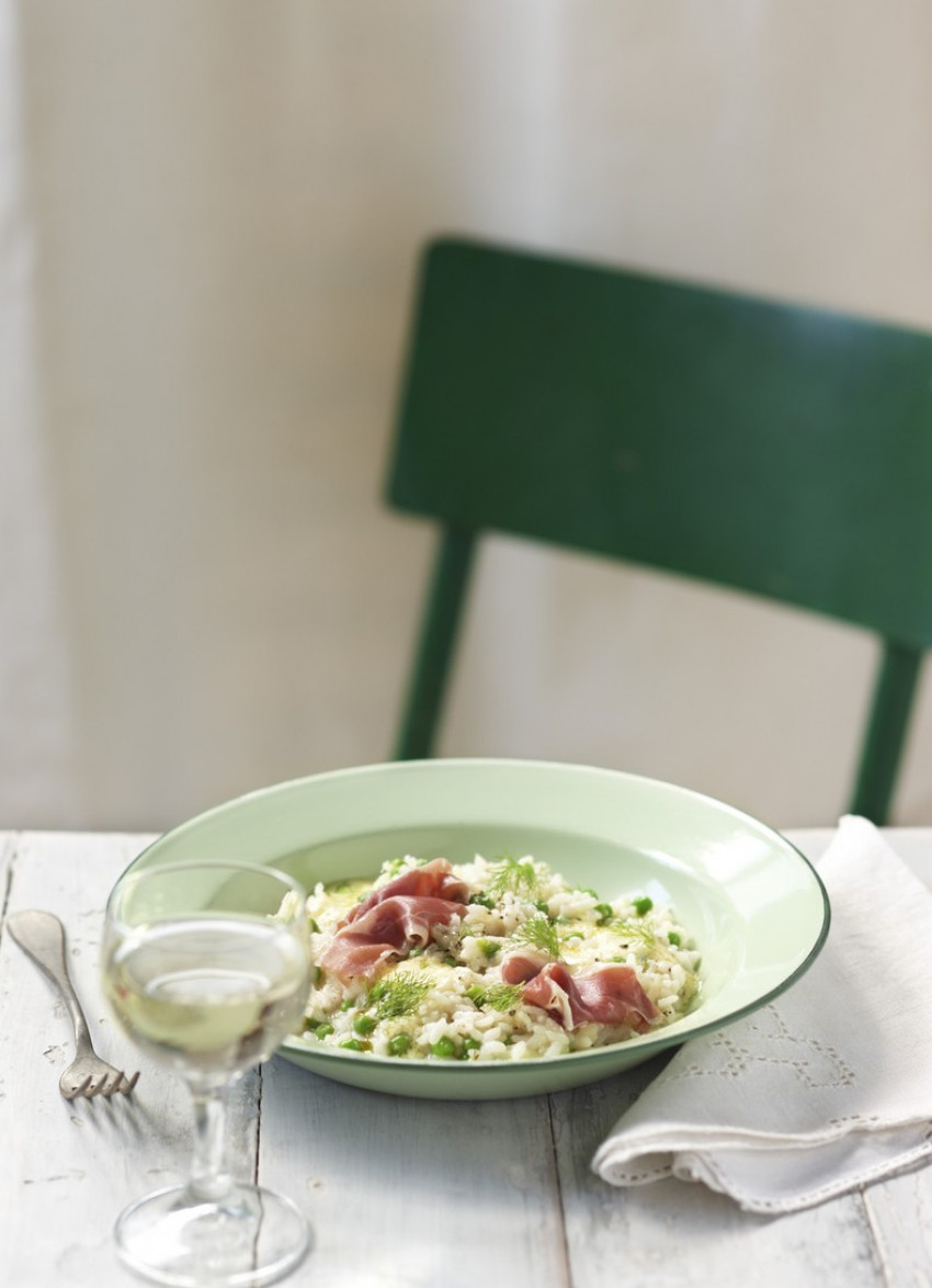 To serve: Place the risotto in warm shallow plates. Top with spoonfuls of mascarpone and drape with a slice of prosciutto if using. Grind over a little freshly ground pepper and a drizzle of good olive oil. Serve immediately.