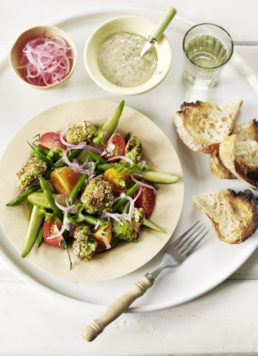 Homemade feta and pea falafel served in a bean, zesty onion, and tomato salad.