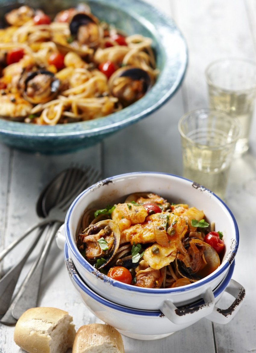 Find all the flavours of the Mediterranean in this delicious seafood pasta. Always use what-ever fish is the freshest and best on the day and serve with crusty bread for mopping up all the lovely juices.