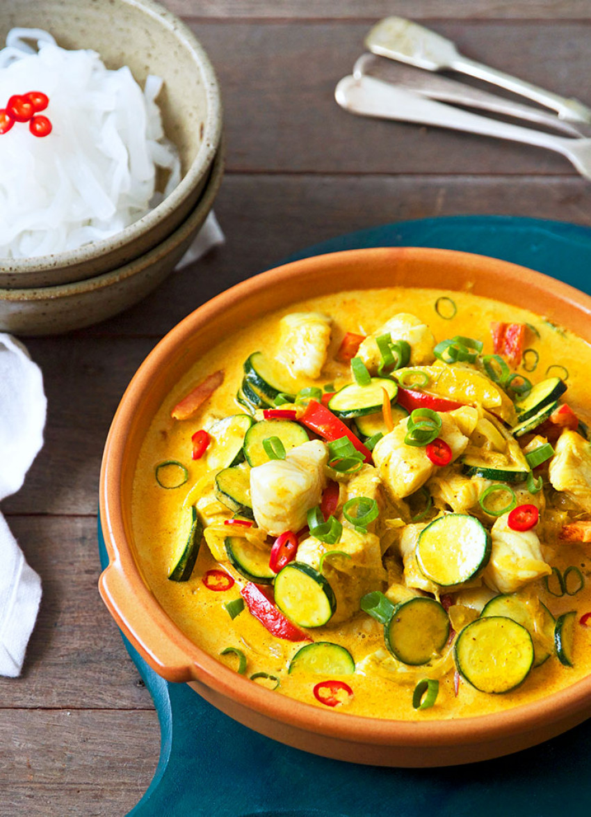 Heat a generous glug of oil in a sauté pan over a medium heat. Add the onion and cook until translucent. Add the curry paste and cook for a further minute. Add the coconut milk, fish sauce and capsicum. Bring to a boil; reduce to a simmer. Add the zucchini and fish. Simmer for 5 minutes; add spring onion, chilli and remove from the heat.
