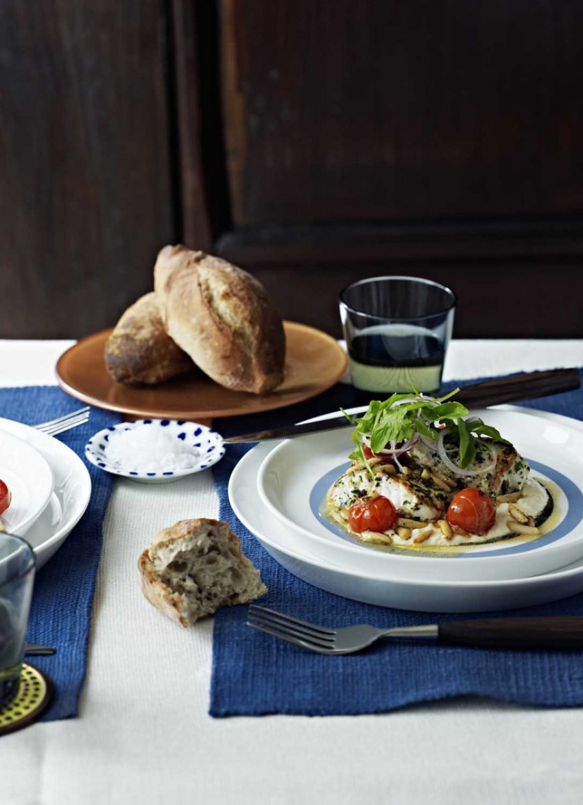 To serve: Spread the hummus on serving plates. Top with a piece of fish and spoon over the tomatoes and pan juices. Combine the rocket and red onion and stack on top of the fish. Serve with warm crusty bread rolls.