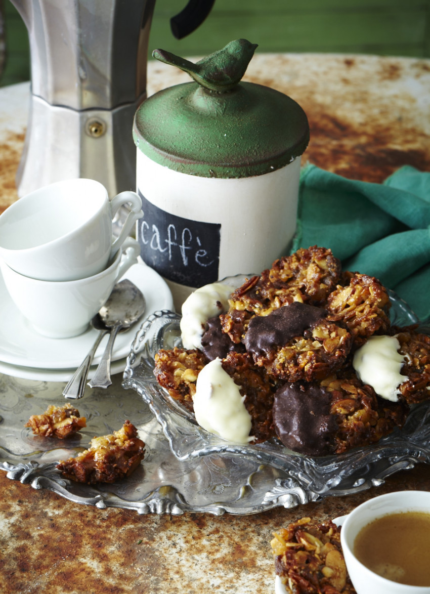 To finish: Dip a third of the florentines in each of the melted chocolates, leaving the remaining plain if desired. Place on baking paper to set. Makes 18
