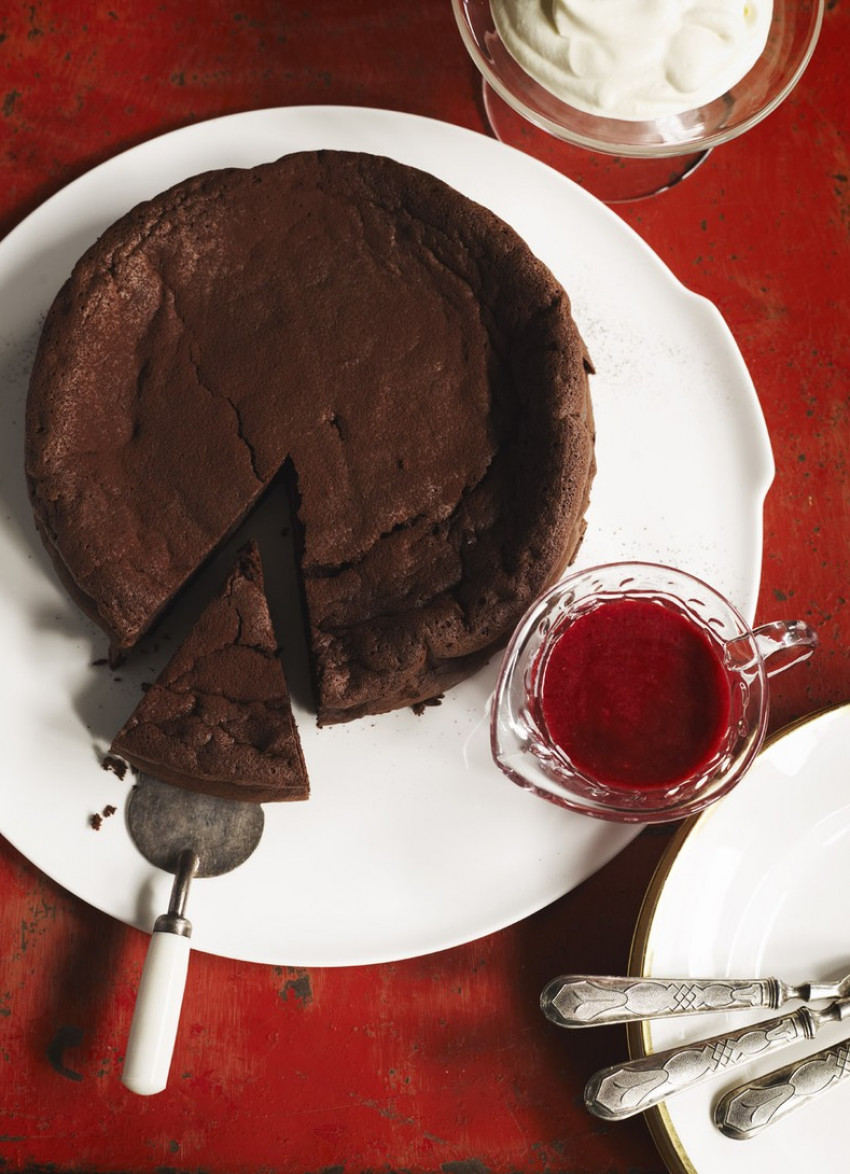 Enjoy this dense, rich chocolate cake with dollops of cream and lashings of fruity raspberry couli.