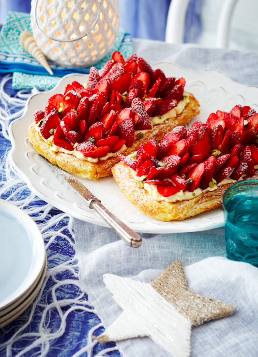 To serve: Assemble the tarts just before serving so the pastry stays crisp. Spread the cream evenly over the two tarts. Top with the strawberries then sprinkle with pistachios and a dusting of icing sugar.