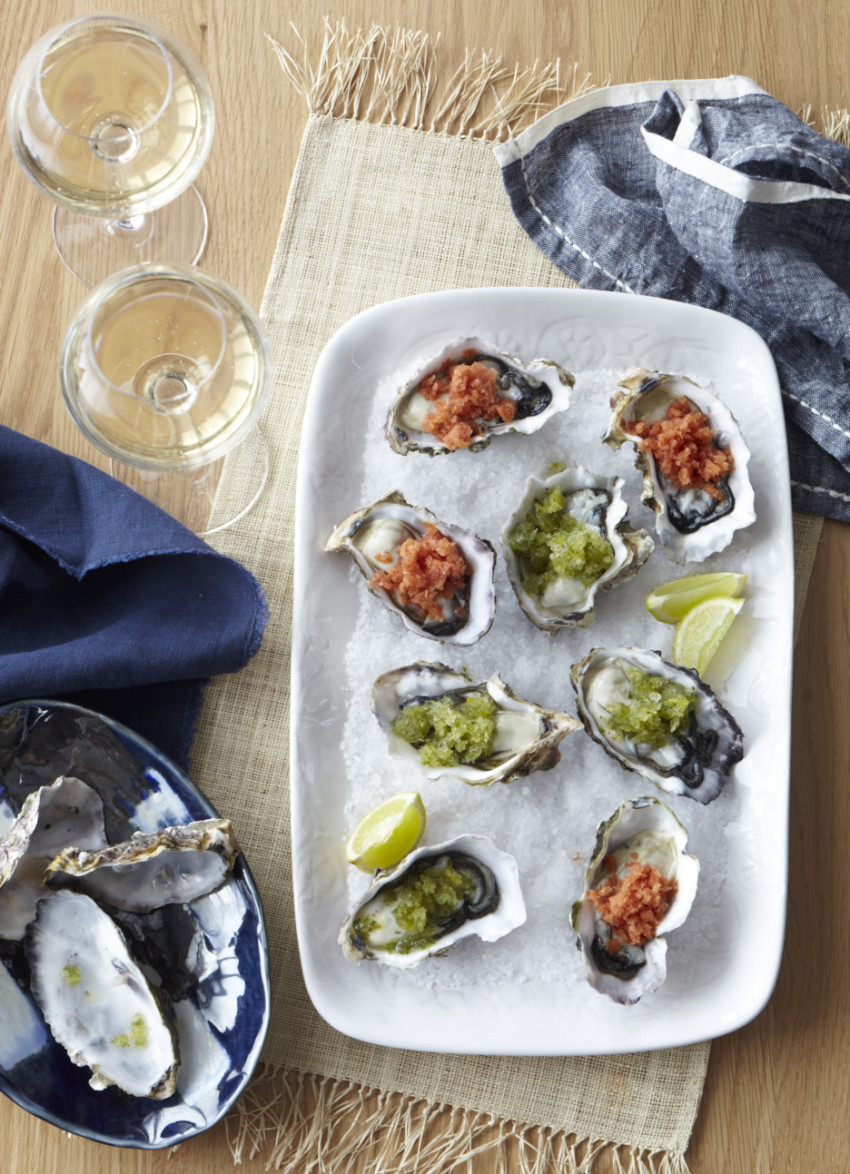 Plump juicy oysters get topped with these zesty fresh granitas. Make sure the oysters are well chilled before serving.