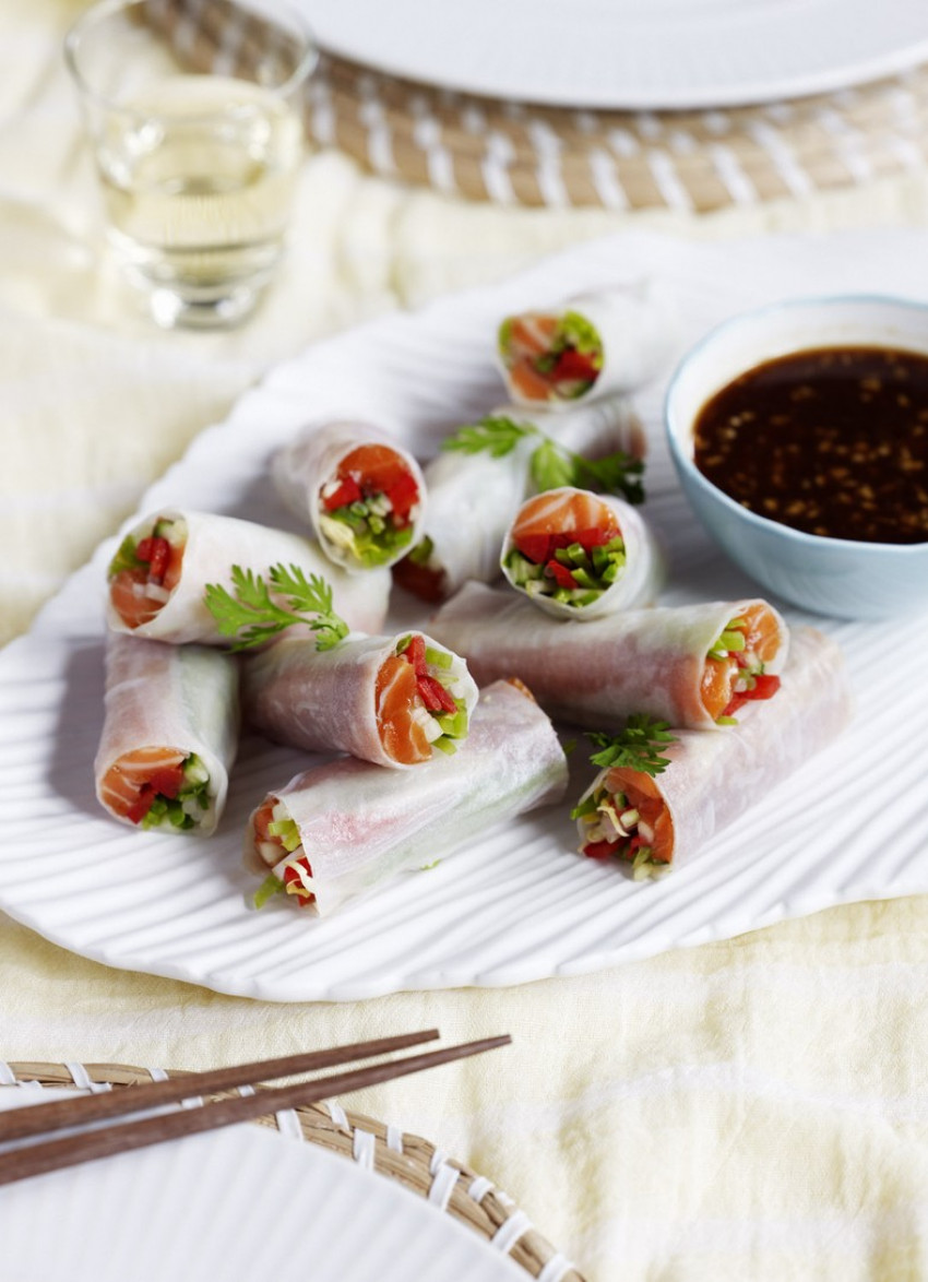 To assemble: Fill a wide shallow bowl with hot water and lay a tea towel on the bench in front of you. Soak a rice paper briefly in water until softened then place it on the tea towel. Don’t let the wrapper get too soft or it will disintegrate. Arrange a line of salmon, cucumber, snow peas, capsicum and bean sprouts across the bottom of the wrapper. Fold the bottom of the rice paper over the filling and roll up tightly into a long cylinder. Do not fold in the sides. Place each roll, as it is made, on a plastic wrap-lined tray, making sure they are not touching. Repeat with the remaining wrappers and filling. If you are not serving the rolls immediately, cover with plastic wrap and refrigerate.