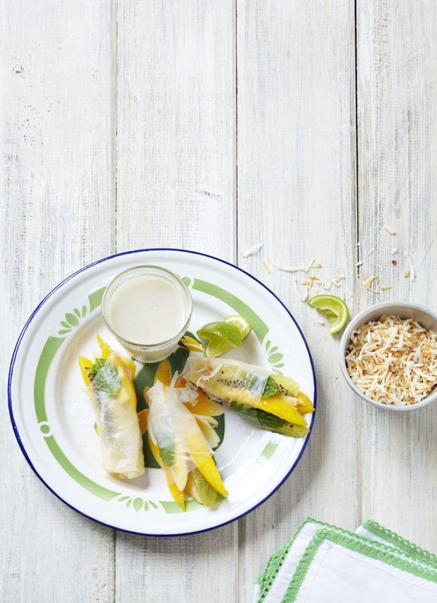 To assemble: Fill a wide, shallow dish with warm water. Soak each rice paper briefly in the water until softened then lay it flat on a clean tea towel. Place a mint leaf on each one with the top sticking over the edge a little. Top with 2 pieces each of the fruit and another mint leaf. Fold the bottom over as you roll it up tightly. Repeat with the remaining ingredients and place the rolls on a plastic wrap-lined tray, ensuring they aren’t touching.