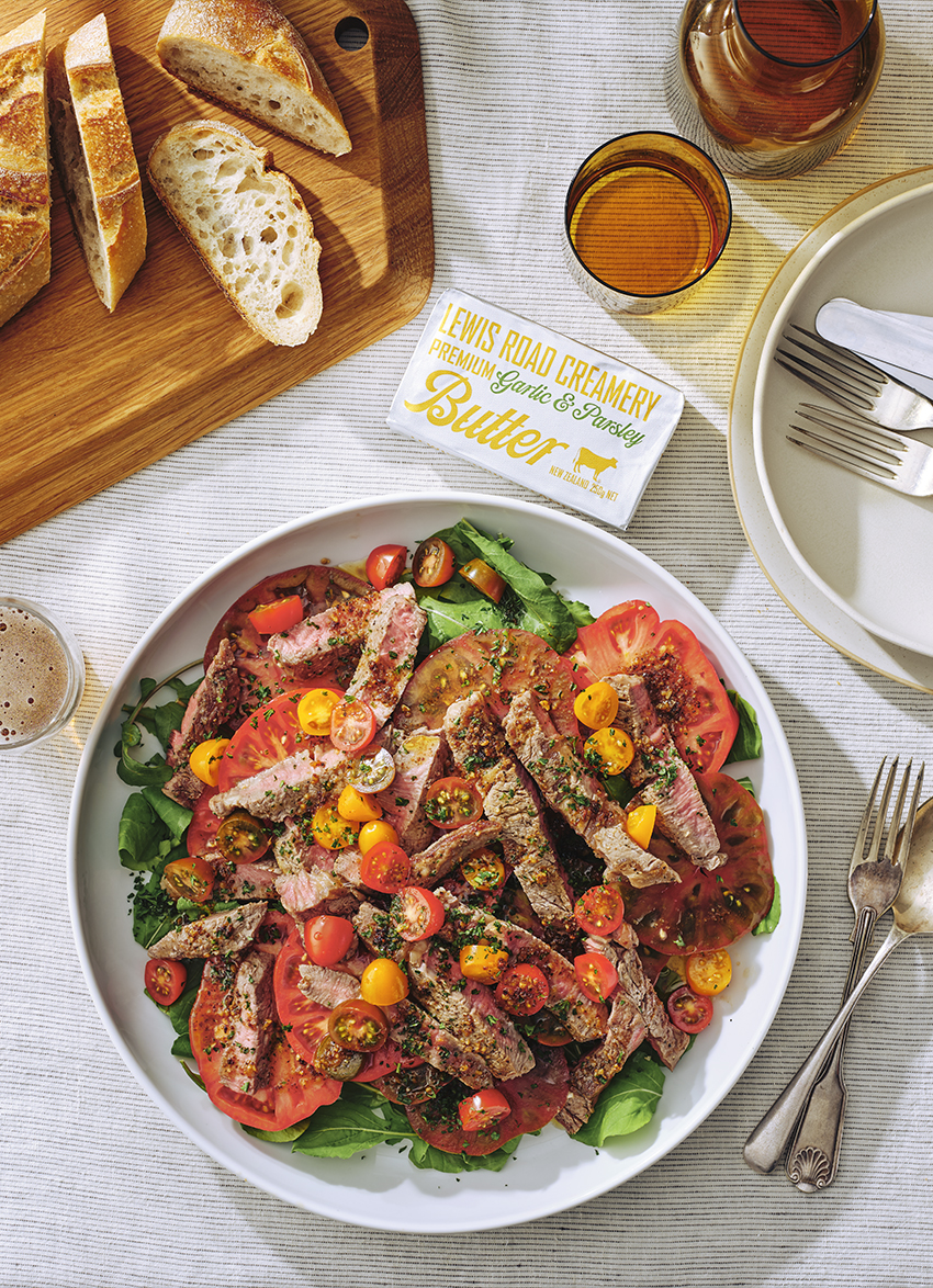 Tender steaks infused with warm garlic & parsley butter paired with a bright tomato and rocket salad create a dish that balances richness with fresh garden flavour.