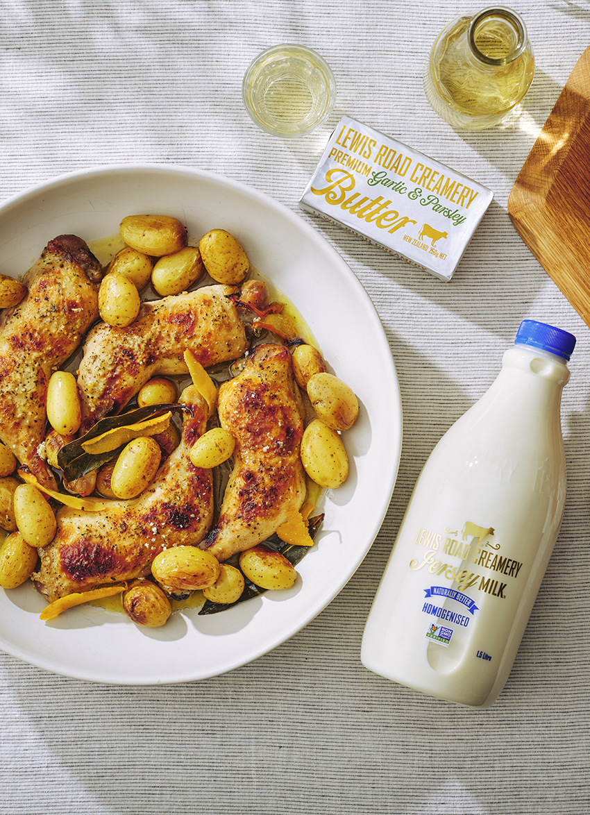 Tender milk brined chicken roasted with garlic and parsley butter, lemon and herbs, served with golden baby potatoes for a fragrant and comforting family favourite.