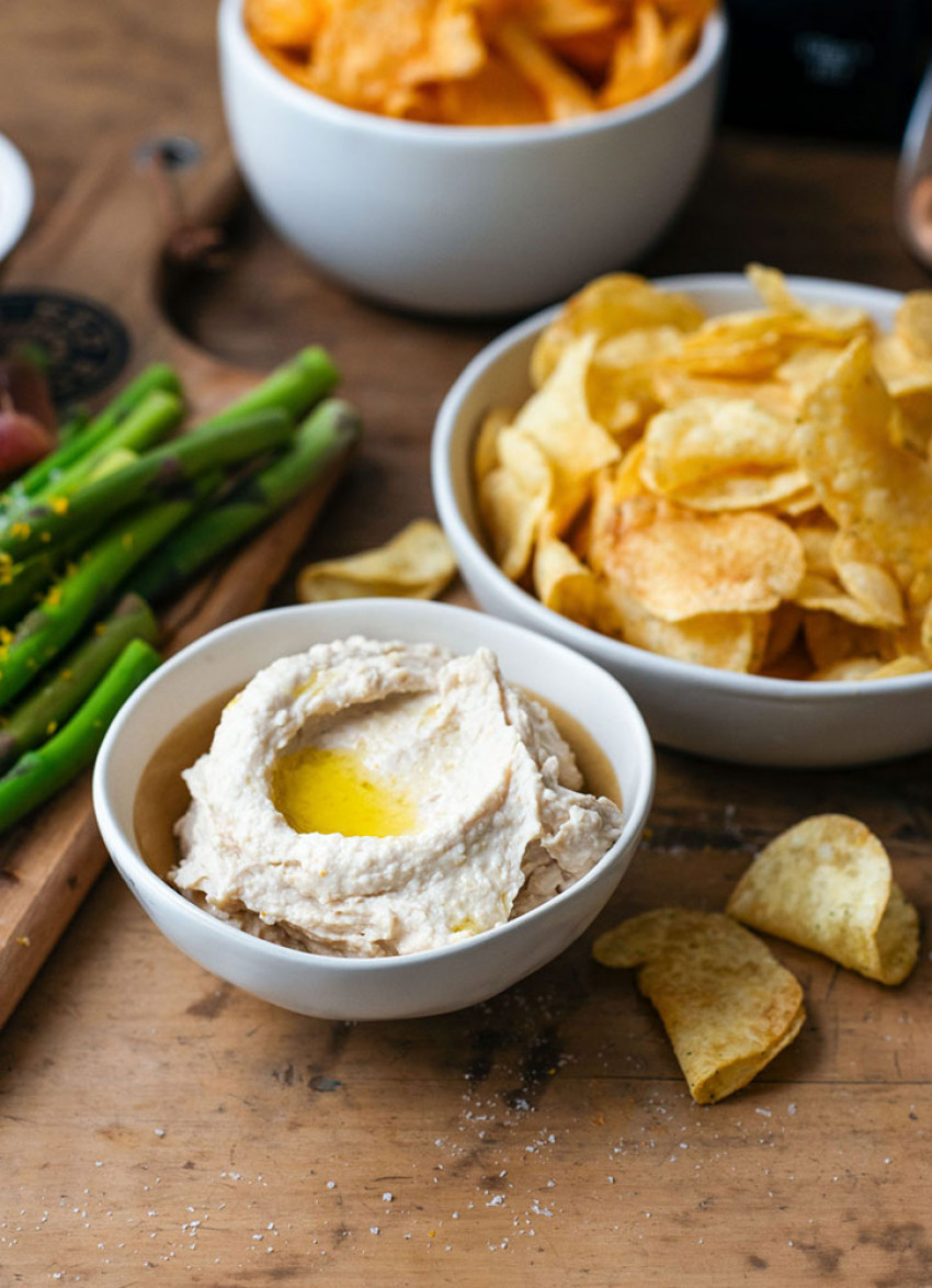 This dip has a garlicky white bean base, sharpened up with lemon zest and juice, made silky with extra virgin olive oil, mayo and ricotta and given a bit of grunt with garlic. Sea salt is non-negotiable here – those white beans like good seasoning!